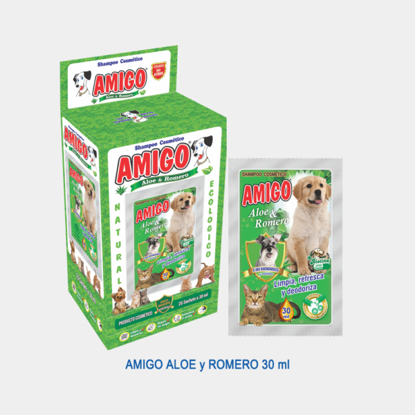 SHAMPOO AMIGO Aloe – Romero, Contiene exquisitas aromas naturales que perfuman, suaviza, y re-acondicinan el pelaje desenredando y permitiendo peinar fácilmente. también puede ser usado con toda seguridad en el aseo de animales de exposición sin riesgo alguno.